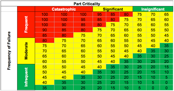 Each of the factors is examined and given a numerical score between 0 and 100. These scores are converted into a “part criticality” ranking system.